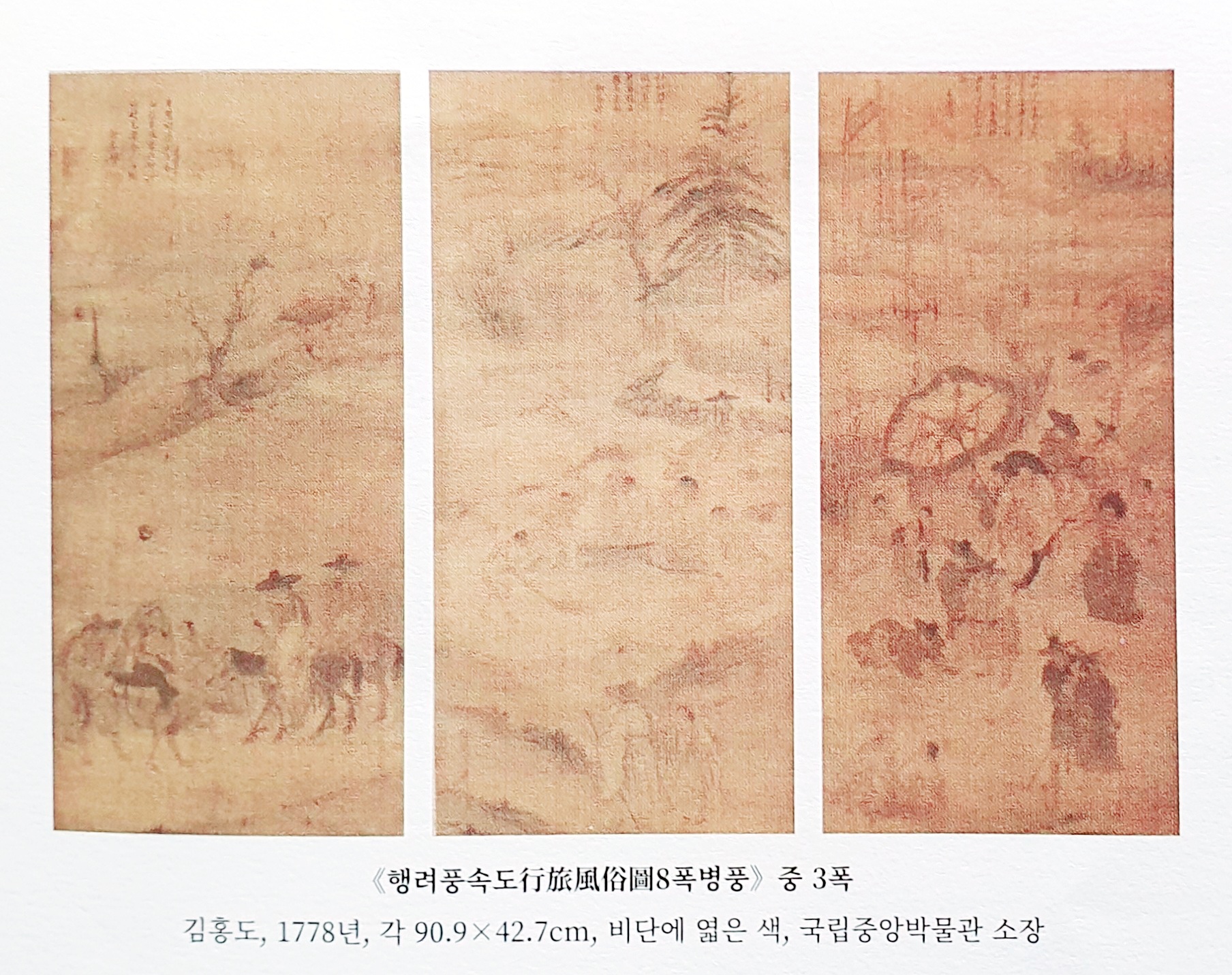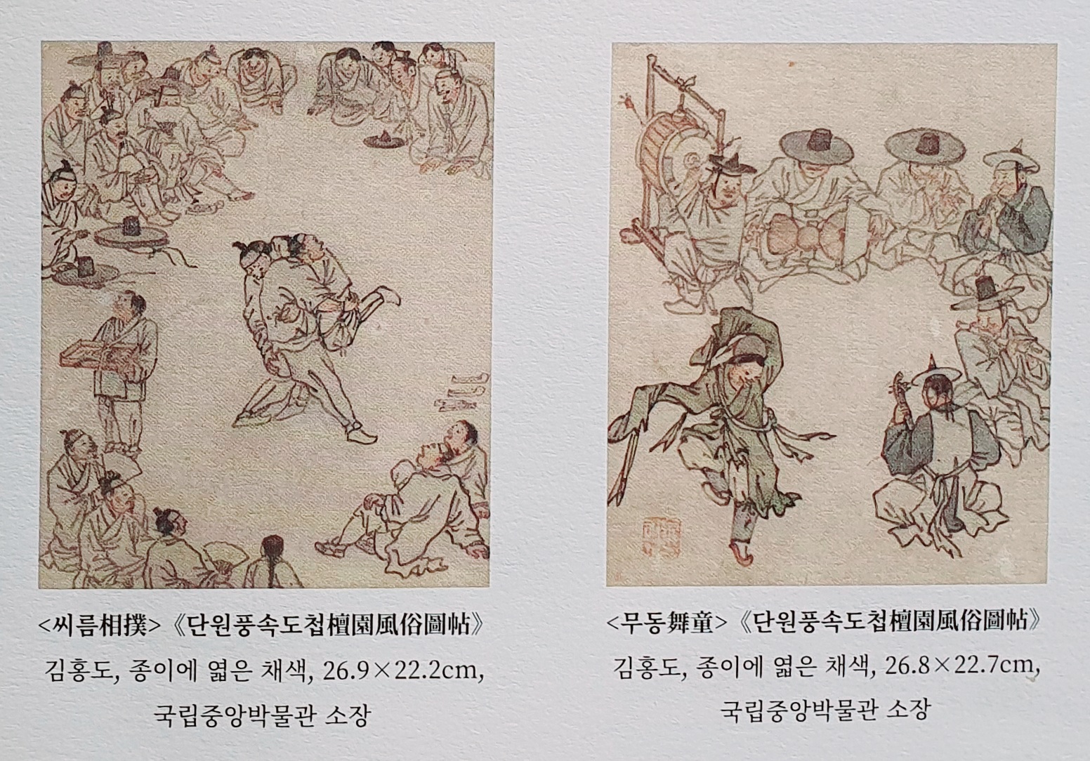 이와 달리 김홍도의 대표 적인 풍속화로 알려진 <단원풍속도첩權園風俗圖帖>에는 배경을 생략하고, 핵심 장면만 간략하게 묘사하여 각 주제가 잘 드러나 있다. 김홍도의 풍속화는 대체적으로 서민의 일상과 생업을 소재로 한 것이 많으며 한국적인 해학과 정취를 담아 생생하게 전달한다.