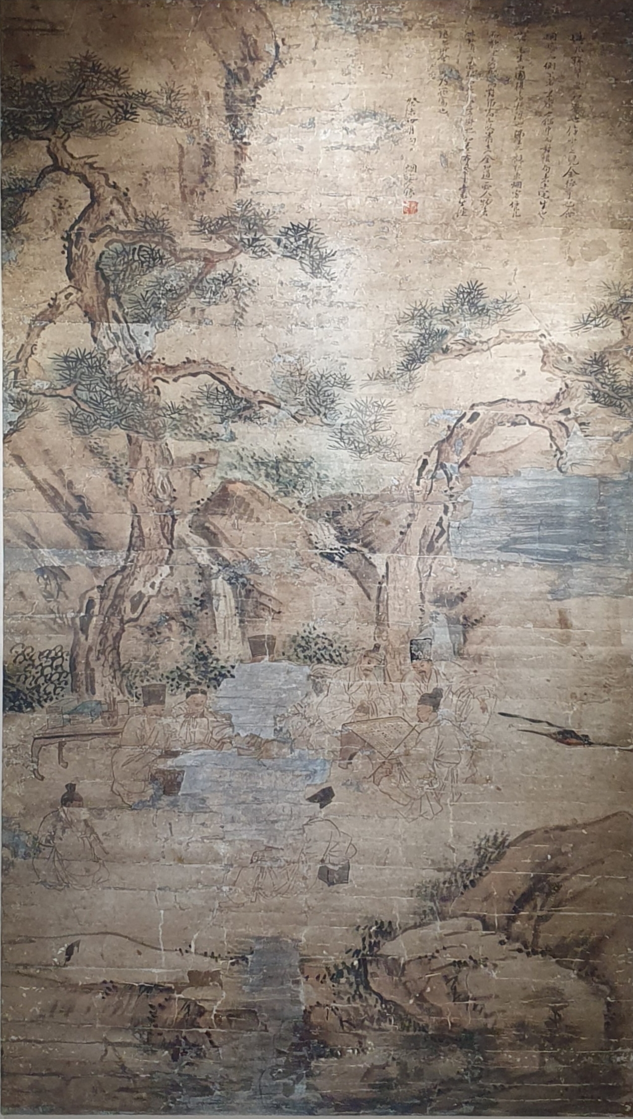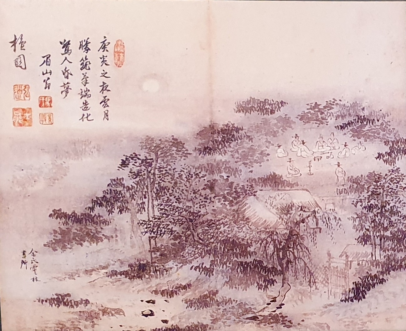 김홍도와 친분이 있던 송석원시사 동인들의 문학모임을 그린 것이다. 송석원시사는 千壽慶(1757-1818)을 중심으로 1786년 결성되어 활발한 활동을 하였는데, 이해 6월15일(유두일)에도 시회를 열고 그 광경을 김홍도에게 부탁하여 그린 것이다. 달밤 뜰에서의 시회 장면을 그렸는데, 담묵으로 선염하여 어슴푸레한 대기의 느낌을 잘 표현했다.