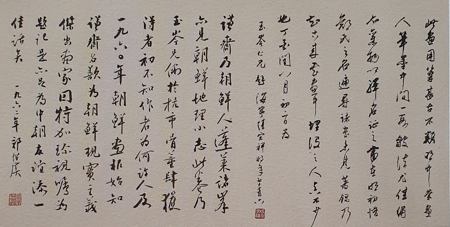 謙齋乃朝鮮人,蓬萊諸峯,亦見朝鮮地理小志, 此卷,乃玉岑兄偶於杭市骨董肆獲得者。 初不知作者何許人,乃一九六十年朝鮮畫報,始知識齋名歌。 為朝鮮現實主義傑出畫家,因特加珍視,囑為題記,是亦足協中朝友誼,添一佳話矣, 一九六二年 郭紹虞