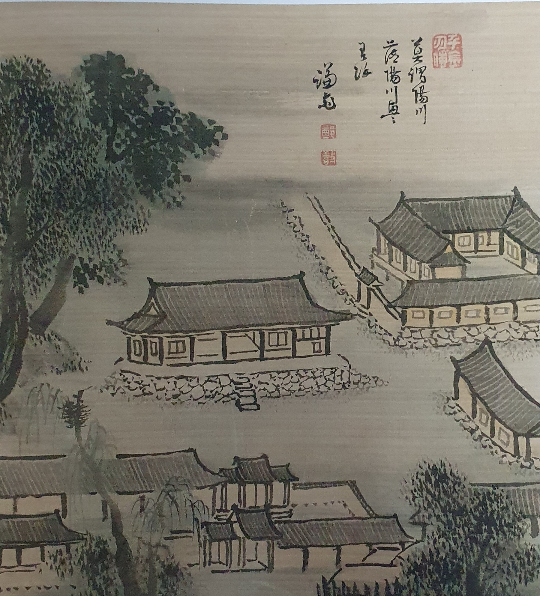 이엉을 얹은 토담, 초가지붕의 일각문(一閣門), 큰 버드나무와 오동나무, 버드나무를 타고 오르는 덩굴이 기품 있게 그려져 있다. 겸재는 이런 조출한 생활 분위기를 꾸며갈 수 있는 개결한 선비였기에, 조선 후기 문화 절정기의 꽃인 진경산수화를 창안하고 완성시킨 것이 아닌가 하는 생각이 든다.
