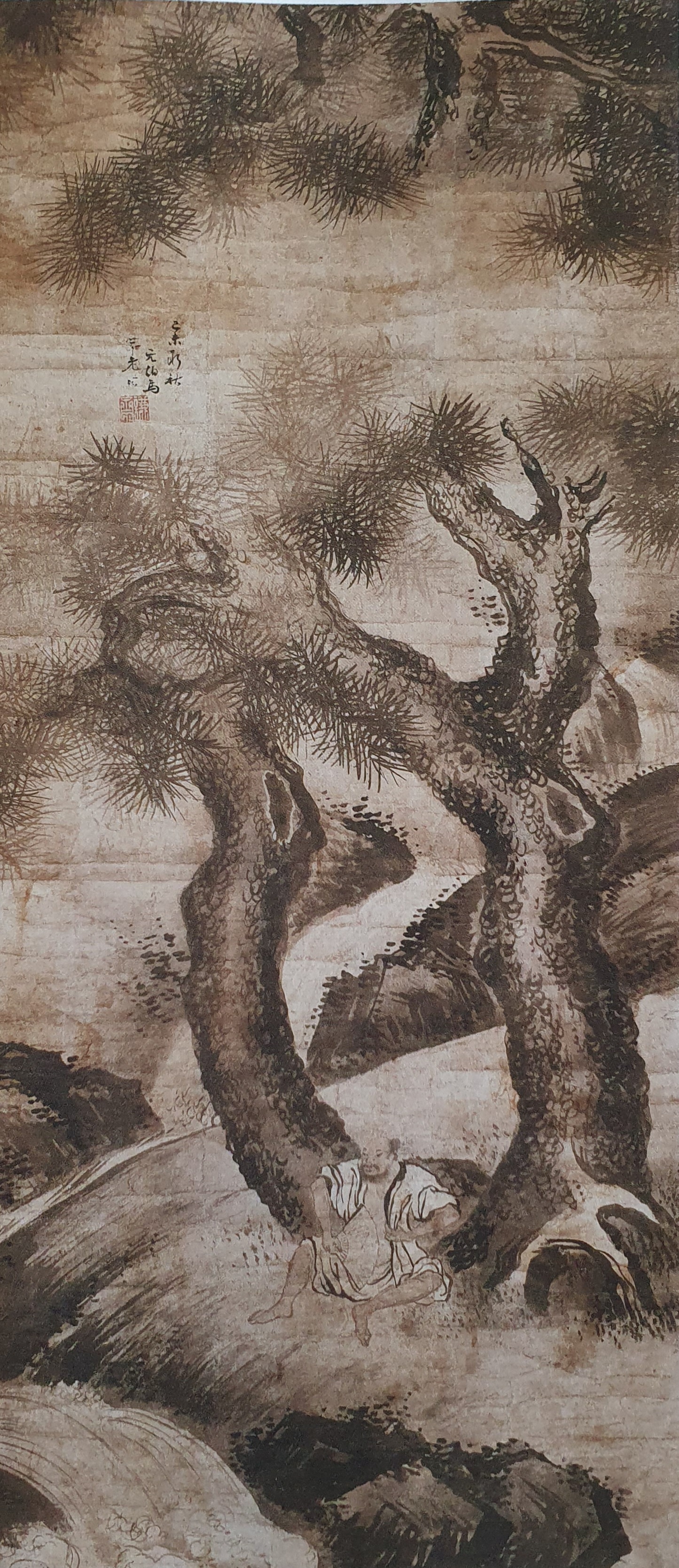 소나무 아래에서 더위를 피하고 바람을 쐬는 인물을 묘사하였다. 더위에 지친 한 인물이 두 그루의 늙은 소나무 아래에서 옷을 풀어헤치고 거듭 부채질을 하고 있다. 소나무 뒤에는 시냇물이 3단에 걸쳐 떨어져 흐르고 있어 보는 이에게 시원함을 전달해 준다. 정선은 이 그림에서 먹의 강한 흑백 대조와 나무 장작을 도끼로 팬 것과 같은 필법인 부벽준을 적극적으로 활용하였다. 화면 상단 제발을 통해 1739년 초가을에 김상리(金相履,1671-1748)에게 이 그림을 그려 주었음을 알 수 있다. 김상리 는 이병연과 함께 정선과 빈번히 교류한 인물로, 이 작품은 그 관계를 직접적으로 보여 주는 유일한 작품이어서 주목된다.