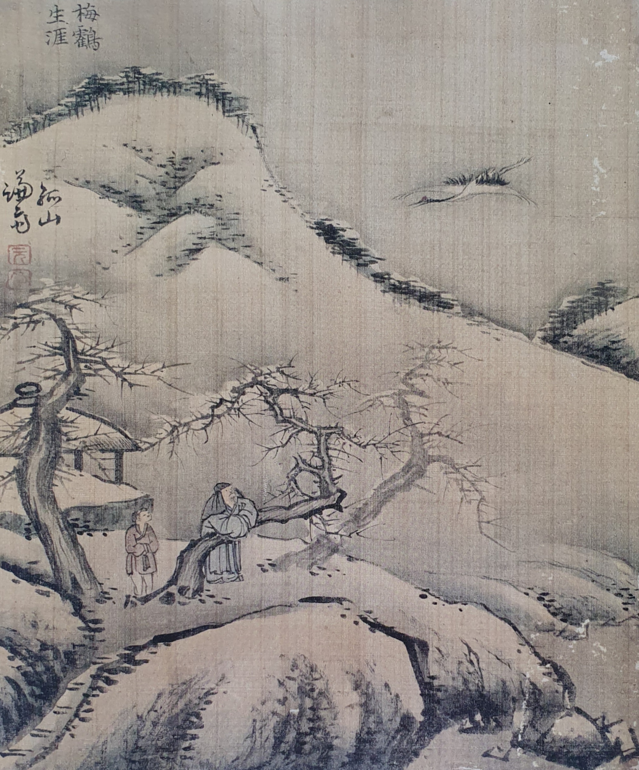 고산에 학을 놓아주는 이 그림은 송(宋)의 임포(林逋, 967-1028) 이야기를 그린 것이다. 임포는 어려서 부모를 잃고 가난했으나 힘써 공부해 시서화에 능했으며 벼슬과 영리에 뜻이 없어 의식(衣食)이 부족해도 걱정하지 않고 은거했다. 나라에서는 그의 높은 뜻을 기려 곡식 등을 지원하고, 사후에는 화정선생(和靖先生)이라는 시호도 내렸다. 또 임포는 고산(孤山)에 은거하며 장가도 들지 않고 홀로 살았는데 매화 심고 학 기르는 것을 낙으로 삼아 매처학자(梅妻鶴子, 매화로 처를 삼고 학으로 아들을 삼음)를 자칭했다고 한다. 특히 호수에 배를 띄우고 있다가 손님이 오면 학을 놓아 보내 손님을 맞이하게 했다고 하니 학이 아들처럼 손님을 맞게 했던 모양이다. 그래서 겸재 정선은 온통 눈 쌓인 겨울, 돌아오는 단정학(丹頂鶴)을 매화나무 등걸에 기대어 바라보는 임포의 모습을 운치 있게 표현했다. 어둠이 내리는 해 질 녘이라 하늘도 땅도 어둠에 묻혀 가니, 후미진 언덕은 더욱 어둡고 가까운 나무는 우람하게 다가오며 먼 나무는 어둠 속으로 희미하게 잠겨 든다. 뒷산 능선의 드문드문한 송림도 어둠에 잠기니, 쌓인 눈은 더욱 빛난다.
