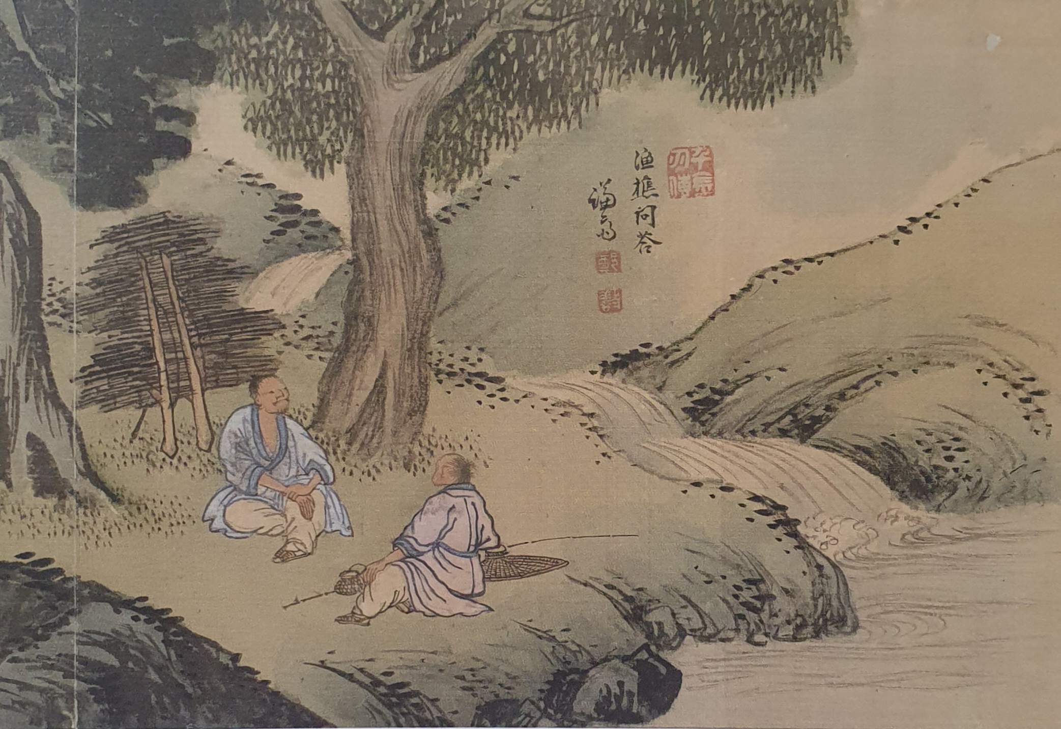 중국의 유학자 소용(邵雍, 1011-1077)은 「어초문답(漁樵問答)」이라는 책을 지어, 어부(漁夫)와 초부(樵夫)가 문답하는 형식을 빌려 자신의 학설을 피력했다. 이러한 낭만적인 소재는 화제(畵題)로 많은 사랑을 받게 되어, 중국과 우리나라에서 많이 그려졌다. 겸재는 '어초문답'이라는 그림 주제를 나무지게를 받쳐 놓은 나무꾼과 낚싯대, 망태, 삿갓을 벗어 놓은 낚시꾼의 모습으로 그려냈다. 시냇물이 여울져 큰물로 흘러들고, 큰 나무 그늘에 앉아 고담준론(高談畯論)을 펴고 있다. 나무꾼과 낚시꾼의 복색은 중국식이지만, 작대기를 받쳐 놓은 나무지게는 우리의 것이다. 중국의 고사(故事)마저 조선의 모습으로 바꾸어 낸 겸재 특유의 진경식 고사화라고 할 수 있다.