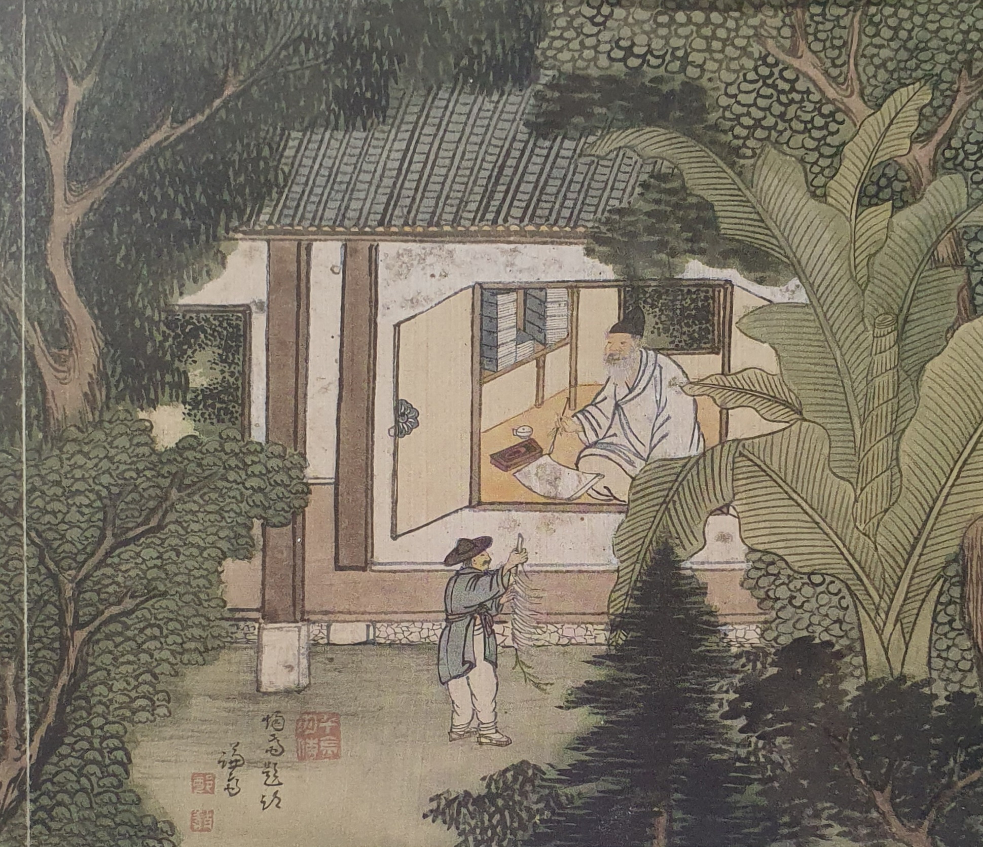 파초(芭蕉)와 각종 나무가 마당에 가득 들어차서 초여름의 울창한 녹음을 드리웠는데, 탕건(宕巾)과 중치막의 평상복 차림을 한 초로(初老)의 선비가 문방사우(文房四友)를 벌려 놓고 앉아 있다. 사랑문 밖에는 심부름 온 사람이 마당에 서서 웅어 꿰미를 들어 보이고, 선비는 반가운 얼굴로 붓을 들고 시상(詩想)을 가다듬고 있다. 풍부한 수염과 건장한 풍채로 관후(寬厚)한 장자풍(長者風)이 넘쳐나는 점잖은 선비는 정확히 누구인지 알 수 없으나, 최재라는 호는 겸재의 선배로는 송방조(宋邦祚, 1567-1618), 김보택(金普澤,1672-1717), 후배로는 이존중(李存中, 1703-1761)이 쓴 것으로 알려져 있다. 그림의 주인공이 누구인지 정확하지 않지만 조선 후기 사대부의 주거 환경과 생활 모습을 알 수 있는 소중한 그림이다.