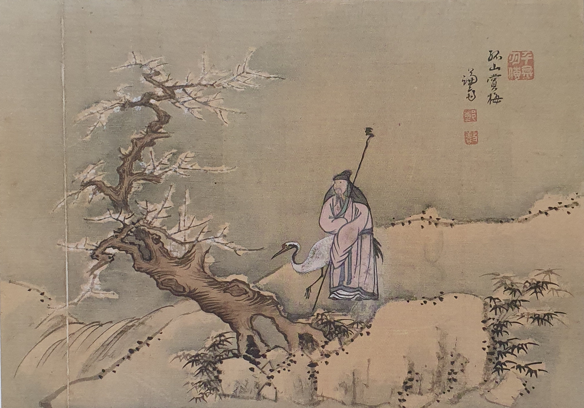 중국 북송(北宋)의 서화가(書畵家) 고산 임포(孤山 林逋, 967-1028)는 매화를 부인, 학을 자식 삼아 살아 매처학자(梅妻鶴子)라고 했는데, <고산상매>는 그 고고(孤高)한 삶의 모습을 그린 작품이다. 겸재는 임포가 학을 놓아주는 방학(放鶴)을 주제로 한 <고산방학(孤山放鶴)>을 그리기도 했다. 이 그림은 매화 감상을 주제로 하어, 추운 겨울밤 방향(芳香)을 토해내는 묵은 매화를 임포가 학을 데리고 즐기고 있는 모습으로 그렸다. 속이 빌 정도로 해묵은 둥치에 새 가지마다 흰 매화꽃을 달고 있는 고매(古梅)의 품격도 그것이려니와, 고산의 곁을 바짝 따르는 학의 표현은 과연 매처학자란 비유가 어울릴 만하다. 학창의에 복건을 쓰고 긴 지팡이를 짚은 임포의 모습은 조선 선비의 모습이다.