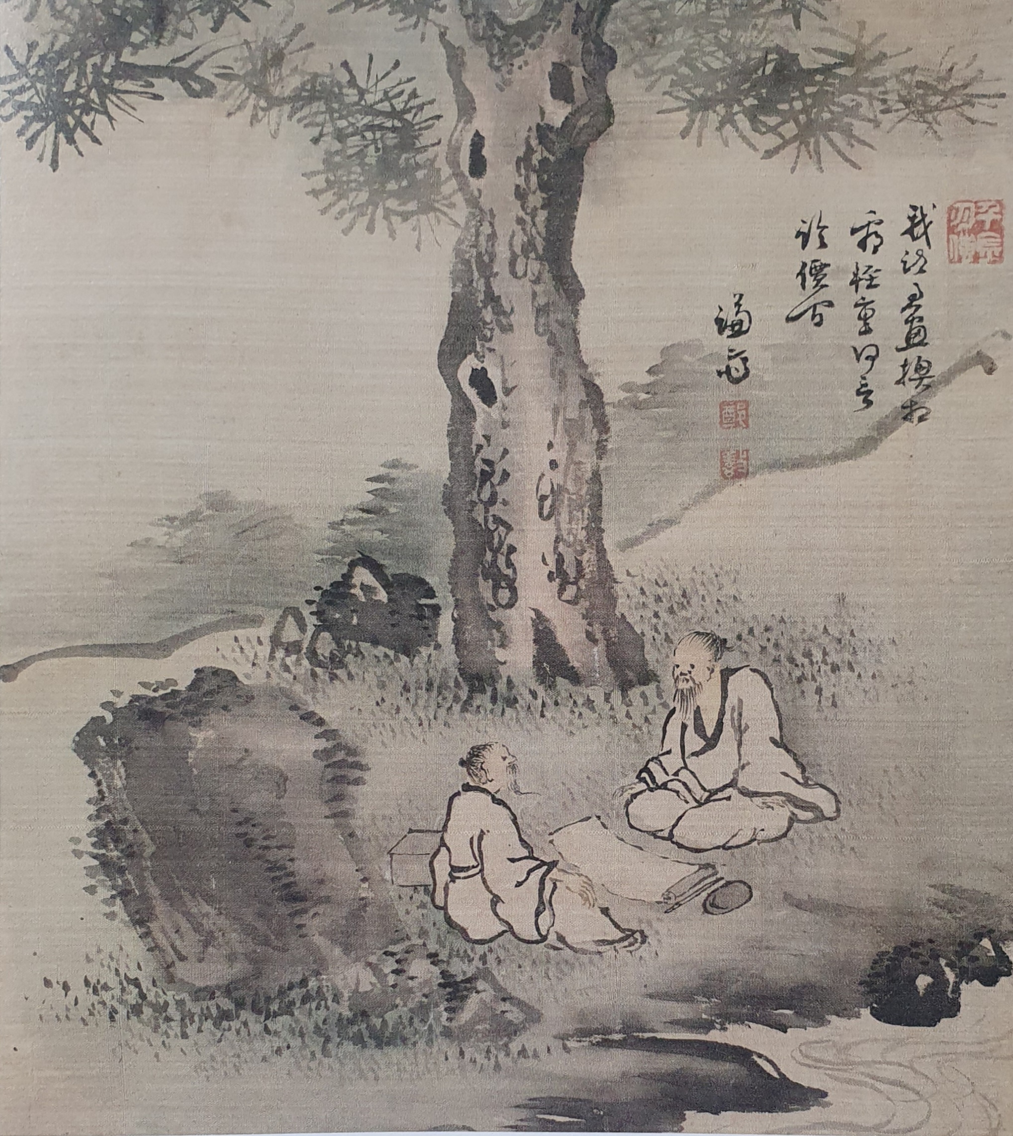 몰골묘(沒骨描)와 감필(減筆)로 추상한 거송(巨松)의 표현이나 발묵법에 가까운 묵찰(墨擦)로 파묵한 바위와 토파(土坡)의 표현, 청묵의 훈염으로 일관한 임상(林狀) 청두점을 보태어 나타낸 초상(草狀) 등 어느 것 한 가지도 극도의 노련미를 보이지 않는 것이 없다. 두 사람이 '시화환상간'의 약속을 하는 모습으로 잠시의 헤어짐도 섭섭해 시화(詩畵)를 바꿔보자고 굳게 약속하는 정경이다. 얼굴을 보이고 앉은 노인이 사천, 그와 마주 앉은 코 큰 노인이 겸재일 것이다.