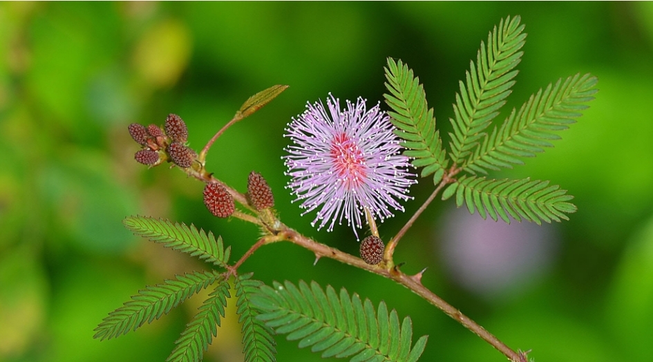 미모사는 단년생 콩과식물로 영어로 sensitive plant, 꽃말 touch-me-not(나를 건들지 마세요) 이듯 잎을 건드리면 곧 아래로 늘어지며 마주보기 잎(複葉)이 닫혀 서로 합해지므로, 마치 부끄럼을 타는 것 같다고 하여 별칭 합수초. 신경초라고도 한다 이런 생태도 신기하고 예쁜 꽃도피어 작은 분재배 로 키우기도 한다.
