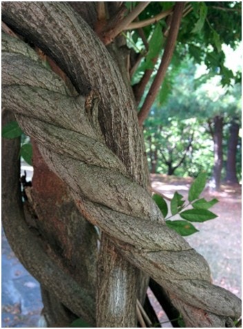 칡이나 등나무처럼 줄기로 다른 식 물을 감싸며 자라는 식물들은 줄기를 감는 방향이 정해져 있습니다. 칡은 다른 식물을 왼쪽으로 꼬면서 감싸는데, 등나무는 오른 쪽으로 꼬면서 감쌉니다.