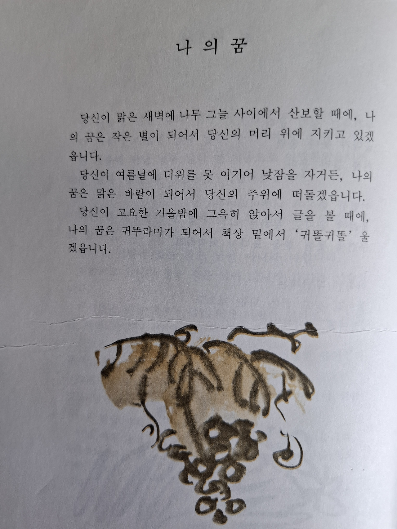 당신이 고요한 가을밤에 그윽히 앉아서 글을 볼 때에, 나의 꿈은 귀뚜라미가 되어서 책상 밑에서 '귀똘귀똘'울 겠읍니다.