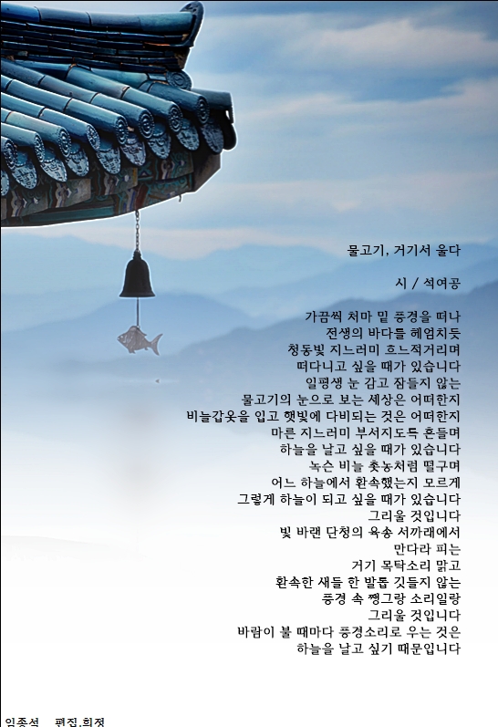 가끔씩 처마 밑 풍경을 떠나 전생의 바다를 헤엄치듯 청동빛 지느러미 흐느적거리며 떠다니고 싶을 때가 있습니다
