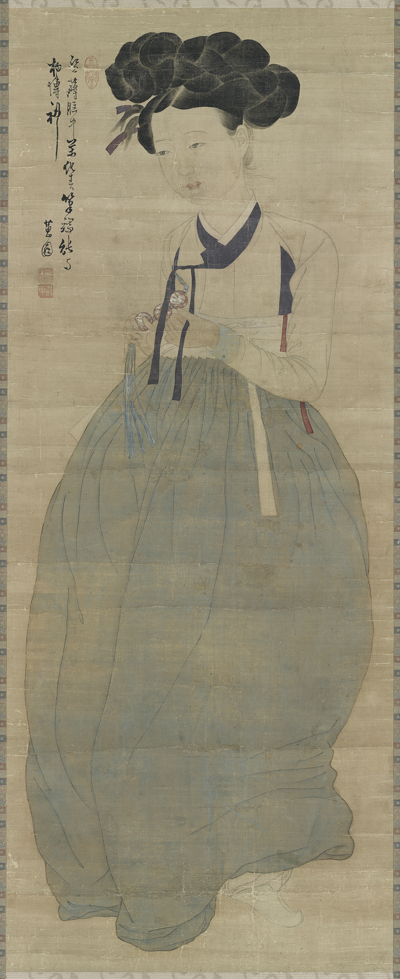 국가유산 보물신윤복 필 미인도 (申潤福 筆 美人圖)‘신윤복 필 미인도’는 조선 후기 풍속화에 있어 김홍도와 쌍벽을 이룬 신윤복(약 1758-1813 이후)이 여인의 전신상(全身像)을 그린 작품으로, 화면 속 여인은 머리에 가체를 얹고 회장저고리에 풍성한 치마를 입고 있다. 부드럽고 섬세한 필치로 아름다운 여인의 자태를 묘사하였고 은은하고 격조 있는 색감으로 처리하였다. 자주색 회장 머리 띠, 주홍색 허리끈, 분홍색 노리개 등 부분적으로 가해진 채색은 정적인 여인의 자세와 대비되어 화면에 생동감을 부여하고 있다. 마치 초상화처럼 여인의 전신상을 그린 미인도는 신윤복 이전에는 남아 있는 예가 거의 없다. 그러므로 이 작품은 19세기의 미인도 제작에 있어 전형(典型)을 제시했다는 점에서 미술사적 의의가 크다.