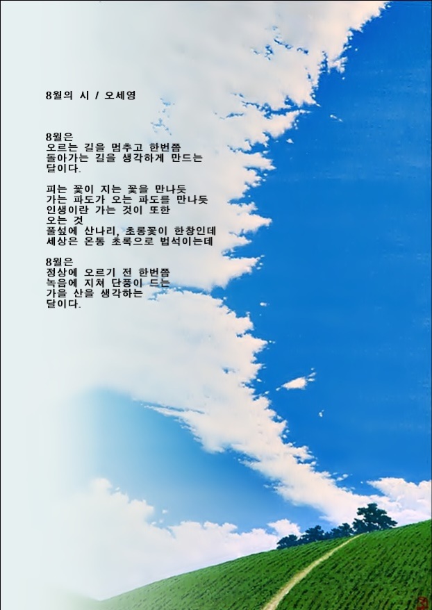 8월의 시-오세영 8월의 시 / 오세영8월은오르는 길을 멈추고 한번쯤 돌아가는 길을 생각하게 만드는 달이다.피는 꽃이 지는 꽃을 만나듯 가는 파도가 오는 파도를 만나듯 인생이란 가는 것이 또한 오는 것 풀섶에 산나리, 초롱꽃이 한창인데 세상은 온통 초록으로 법석이는데8월은정상에 오르기 전 한번쯤 녹음에 지쳐 단풍이 드는 가을 산을 생각하는 달이다. 카테고리 없음 2025.08.10