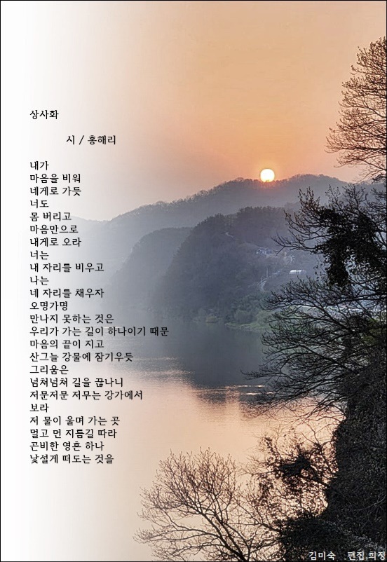 상사화-홍해리 상사화-홍해리내가 마음을 비워 네게로 가듯너도 몸 버리고마음만으로 내게로 오라너는 내 자리를 비우고나는 네 자리를 채우자오명가명 만나지 못하는 것은우리가 가는 길이 하나이기 때문마음의 끝이 지고산그늘 강물에 잠기우듯그리움은 넘쳐넘쳐 길을 끊나니저문저문 저무는 강가에서 보라저 물이 울며 가는 곳멀고 먼 지름길 따라곤비한 영혼 하나 낯설게 떠도는 것을 카테고리 없음 2025.08.10
