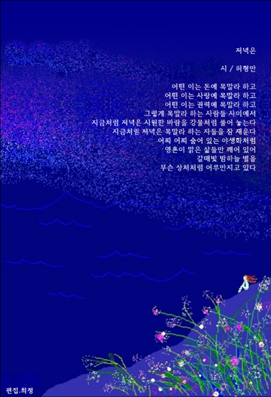머언 바다의 물보래 젖어 오는 푸른 나무 그늘 아래 늬가 말없이 서 있을 적에 늬 두 눈썹 사이에 마음의 문을 열 고 하늘을 내다보는 너의 영혼을 나는 분명히 볼 수가 있었다늬 육신의 어디메 깃든지를 너도 모르는 서러운 너의 영혼을 늬가 이제 내 앞에 다시 없어도 나는 역력히 볼 수가 있구나아아 이제사 깨닫는다 그리움이란 그 육신의 그림자가 보이는 게 아니라 천지에 모양 지을 수 없는 아득한 영혼이 하나 모습 되어 솟아오는 것임을머언 바다의 물보래 젖어 오는 푸른 나무 그늘 아래 늬가 말없이 서 있을 적에 늬 두 눈썹 사이에 마음의 문을 열 고 하늘을 내다보는 너의 영혼을 나는 분명히 볼 수가 있었다늬 육신의 어디메 깃든지를 너도 모르는 서러운 너의 영혼을 늬가 이제 내 앞에 다시 없어도 나는 역력히 볼..