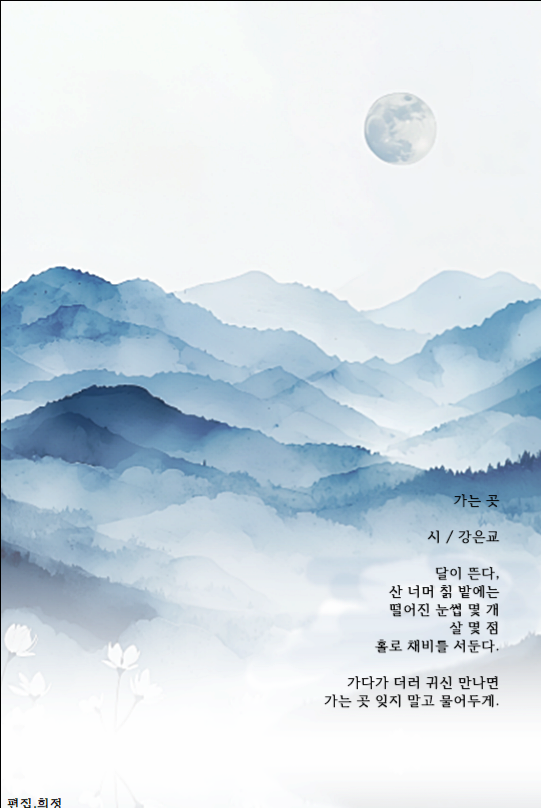 가는 곳-강은교 가는 곳-강은교달이 뜬다.산 너머 칡 밭에는떨어진 눈썹 몇개살몇점홀로 채비를 서둔다.가다가 더러 귀신 만나면 가는 곳 잊지 말고 물어두게. 카테고리 없음 2025.08.26