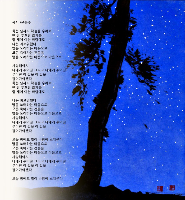 서시/윤동주 서시/윤동주죽는 날까지 하늘을 우러러 한 점 부끄럼 없기를 잎 새에 이는 바람에도 나는 괴로워했다 별을 노래하는 마음으로 모든 죽어가는 것들을 별을 노래하는 마음으로 마음으로사랑해야지나에게 주어진 그리고 나에게 주어진 주어진 이 길을 이 길을 걸어가야겠다 죽는 날까지 하늘을 우러러 한 점 부끄럼 없기를 잎새에 이는 바람에도나는 괴로워했다 별을 노래하는 마음으로 모든 죽어가는 것들을 별을 노래하는 마음으로 마음으로 사랑해야지 나에게 주어진 그리고 나에게 주어진 주어진 이 길을 이 길을 걸어가야겠다오늘 밤에도 별이 바람에 스치운다 별을 노래하는 마음으로 모든 죽어가는 것들을 별을 노래하는 마음으로 마음으로 사랑해야지 나에게 주어진 그리고 나에게 주어진 주어진 이 길을 이 길을 걸어가야겠다오늘 밤에도 별이 바.. 카테고리 없음 2025.08.26