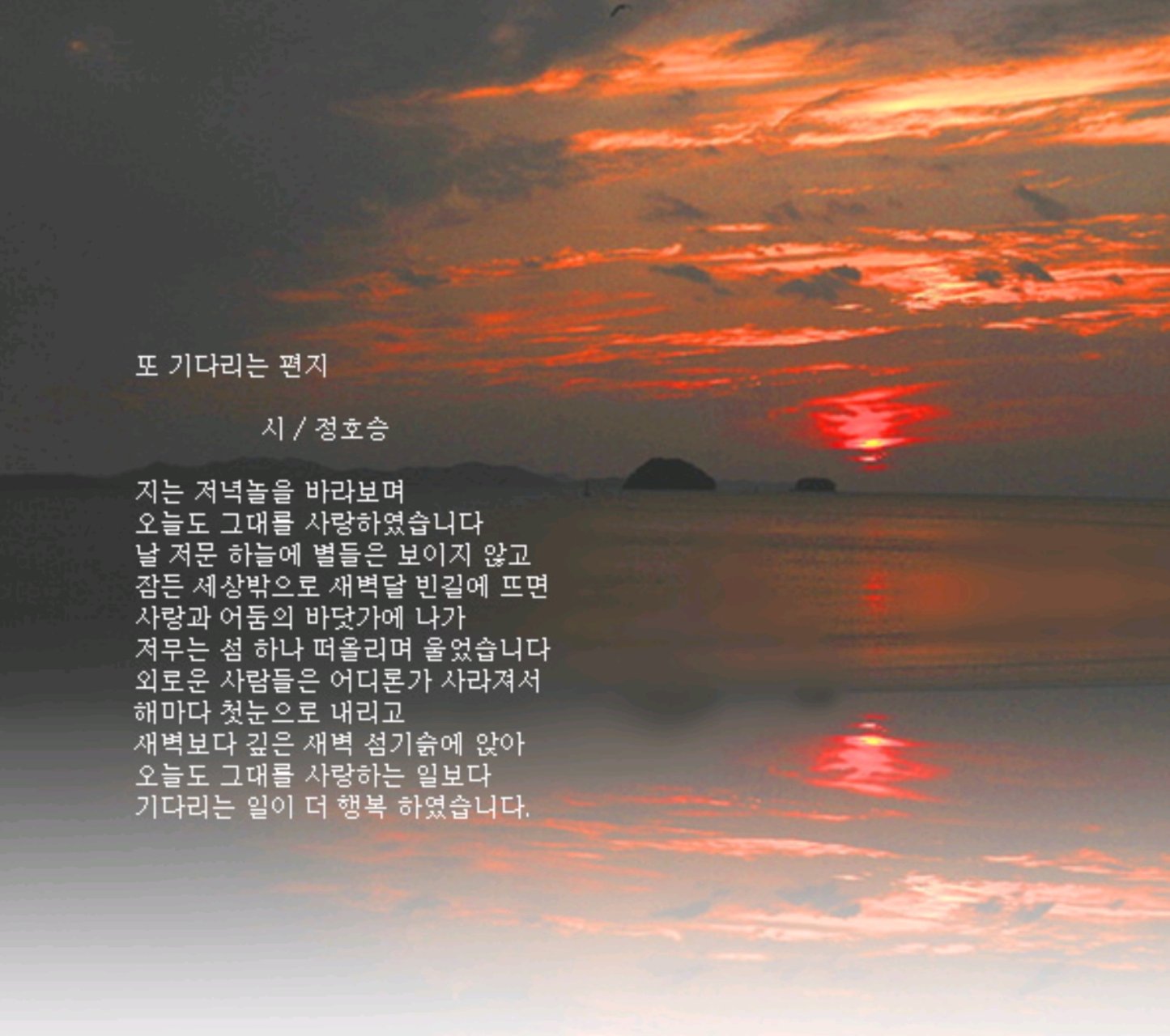 또 기다리는 편지-시/정호승지는 저녁놀을 바라보며 오늘도 그대를 사랑하였습니다 날 저문 하늘에 별들은 보이지 않고 잠든 세상밖으로 새벽달 빈길에 뜨면 사랑과 어둠의 바닷가에 나가 저무는 섬 하나 떠올리며 울었습니다 외로운 사람들은 어디론가 사라져서 해마다 첫눈으로 내리고 새벽보다 깊은 새벽 섬기슭에 앉아 오늘도 그대를 사랑하는 일보다 기다리는 일이 더 행복 하였습니다.