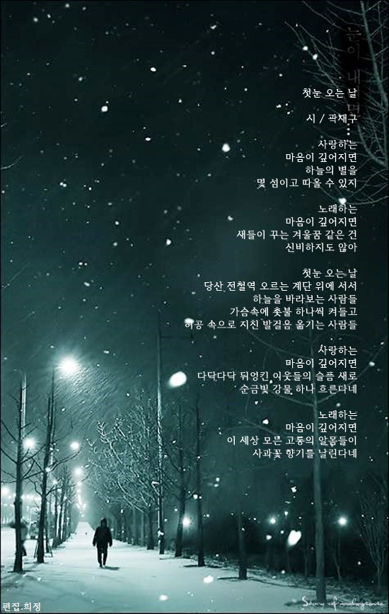 첫눈 오는 날-시/곽채구 첫눈 오는 날시/곽채구사랑하는 마음이 깊어지면 하늘의 별을 몇 섬이고 따올 수 있지노래하는마음이 깊어지면 새들이 꾸는 겨울꿈 같은 건 신비하지도 않아첫눈 오는 날당산 전철역 오르는 계단 위에 서서 하늘을 바라보는 사람들 가슴속에 촛불 하나씩 켜들고 허공 속으로 지친 발걸음 옮기는 사람들사랑하는마음이 깊어지면 다닥다닥 뒤엉킨 이웃들의 슬픔 새로 순금빛 강물 하나 흐른다네노래하는마음이 깊어지면 이 세상 모든 고통의 알몸들이 사과꽃 향기를 날린다네 카테고리 없음 2025.12.05