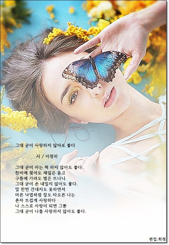 그대 굳이 사랑하지 않아도 좋다 시/이정하 그대 굳이 사랑하지 않아도 좋다시/이정하그대 굳이 아는 척 하지 않아도 좋다.찬비에 젖어도 새잎은 돋고구름에 가려도 별은 뜨나니 그대 굳이 손 내밀지 않아도 좋다.말 한번 건네지도 못하면서마른 낙엽처럼 잘도 타오른 나는혼자 뜨겁게 사랑하다나 스스로 사랑이 되면 그뿐그대 굳이 나를 사랑하지 않아도 좋다. 카테고리 없음 00:05:56