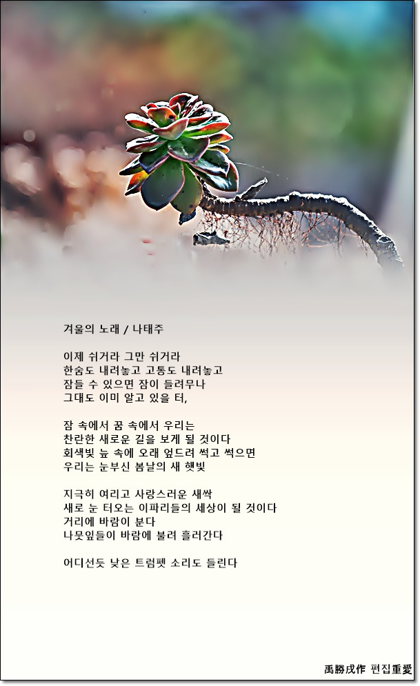 겨울의 노래 / 나태주 겨울의 노래 / 나태주이제 쉬거라 그만 쉬거라 한숨도 내려놓고 고통도 내려놓고 잠들 수 있으면 잠이 들려무나 그대도 이미 알고 있을 터,잠 속에서 꿈 속에서 우리는 찬란한 새로운 길을 보게 될 것이다 회색빛 늪 속에 오래 엎드려 썩고 썩으면 우리는 눈부신 봄날의 새 햇빛지극히 여리고 사랑스러운 새싹 새로 눈 터오는 이파리들의 세상이 될 것이다 거리에 바람이 분다 나뭇잎들이 바람에 불려 흘러간다어디선듯 낮은 트럼펫 소리도 들린다 카테고리 없음 00:08:55