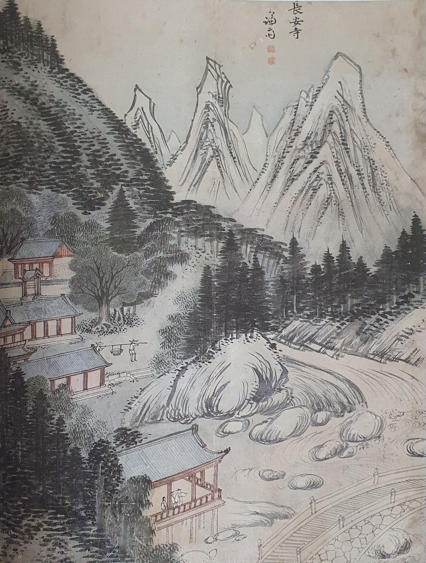 단발령(斷髮嶺)과 철이헌(鐵伊峴)을 넘어 내금강(內金剛)으로 들어가는 초입에 장안사가 있다. 이 그림의 장안사 앞에는 내금강의 물이 모여 내리는 금강천(金剛川), 그 위에 건립된 비홍교(飛虹橋)와 이를 내려다보는 산영루(山映樓)가 하단에 그려져 있다. 장안사의 모습은 비교적 단출하게 그려져 있고, 대신 오른쪽에 암봉(岩峯)이 수림으로 울창한 절의 앞산, 뒷산과 좋은 대조를 보이고 있다. 금강천 시냇물에 두고두고 씻겨, 닳고 닳아버린 바위들은 뭉게구름 같은 권운준법(卷雲皺法)을 써서 암봉의 준법(法)과는 또 다른 대조를 이룬다. 이러한 바위, 나무와 숲 등의 표현에서 추상성이 강하여 정선이 76세인 1751년경의 작품으로 추정한다.