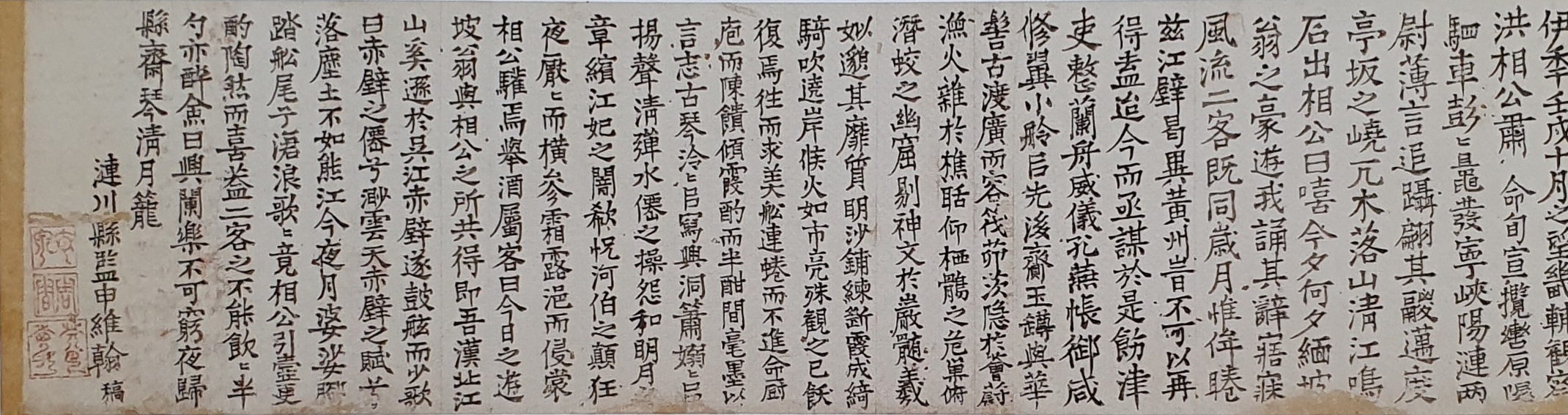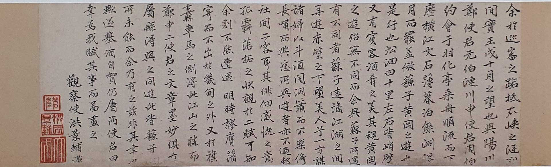 是歲十月之望,同漣件申周伯,陪觀察洪公,游於羽化亭下, 盖用雪堂故事也、周伯以觀察公命,作赋記之,余又畫以繼之, 各藏一本于家,是為漣江壬戌帖云、陽川縣令鄭散書,